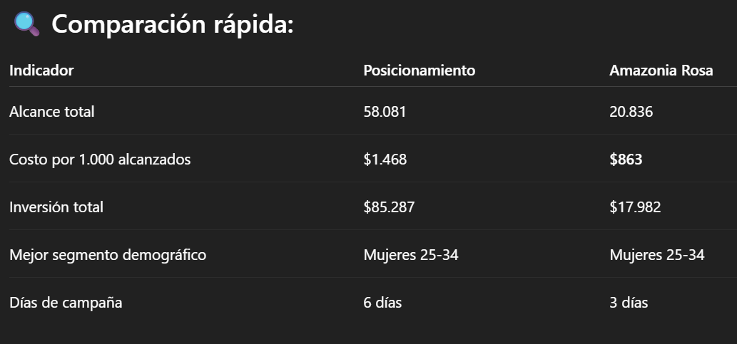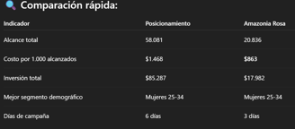 Aunque la campaña lleva solo 3 días con hoy, su rendimiento es muy positivo. El costo por resultado fue significativamente más bajo que la otra campaña, lo que indica un alto interés en la promoción de la sombrilla como incentivo de compra. El mensaje fue directo y claro, logrando captar atención con rapidez.